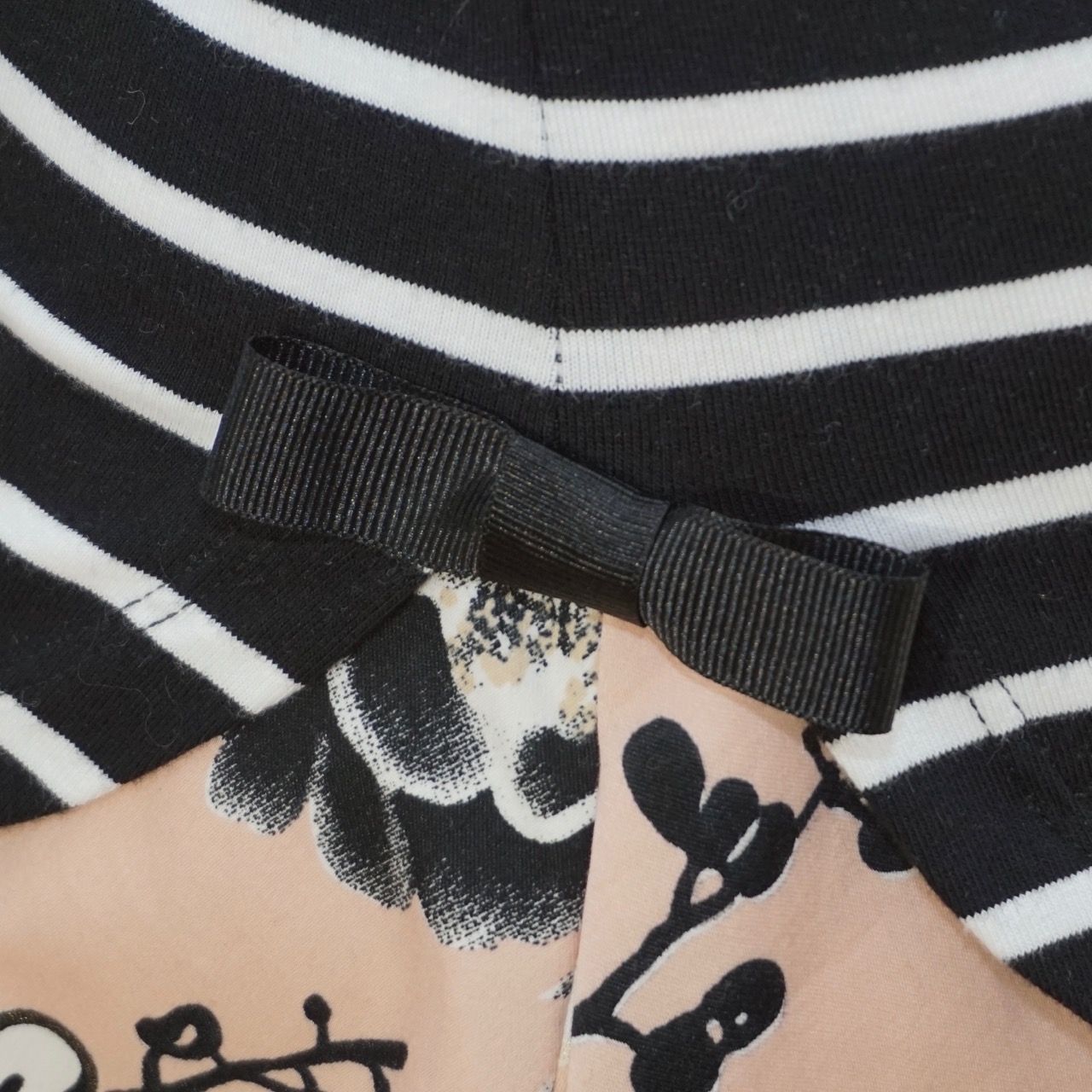 After the skirt was finished I thought it would look good combined with a black and white stripy top. I love this jersey I found again at Eurokangas and I used a pattern I drafted from an old store bought top. I did not want to do your basic top so I curved the hem and added little ribbon bows to do something special. I’m a bit disappointed since the top is quite snug on me. I guess this fabric is not as stretchy as the fabric in the old top I had. I must see how it behaves in the wash and hope for the best.