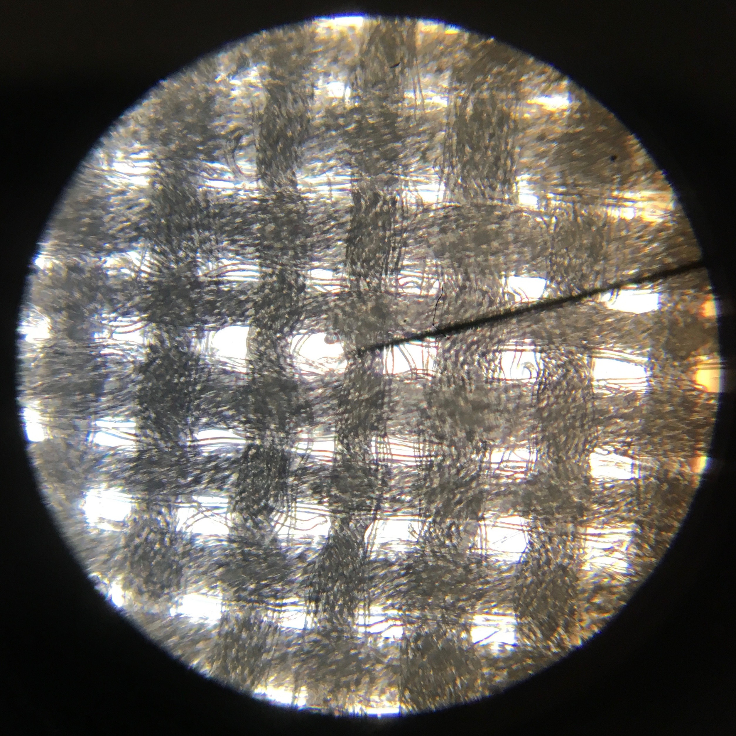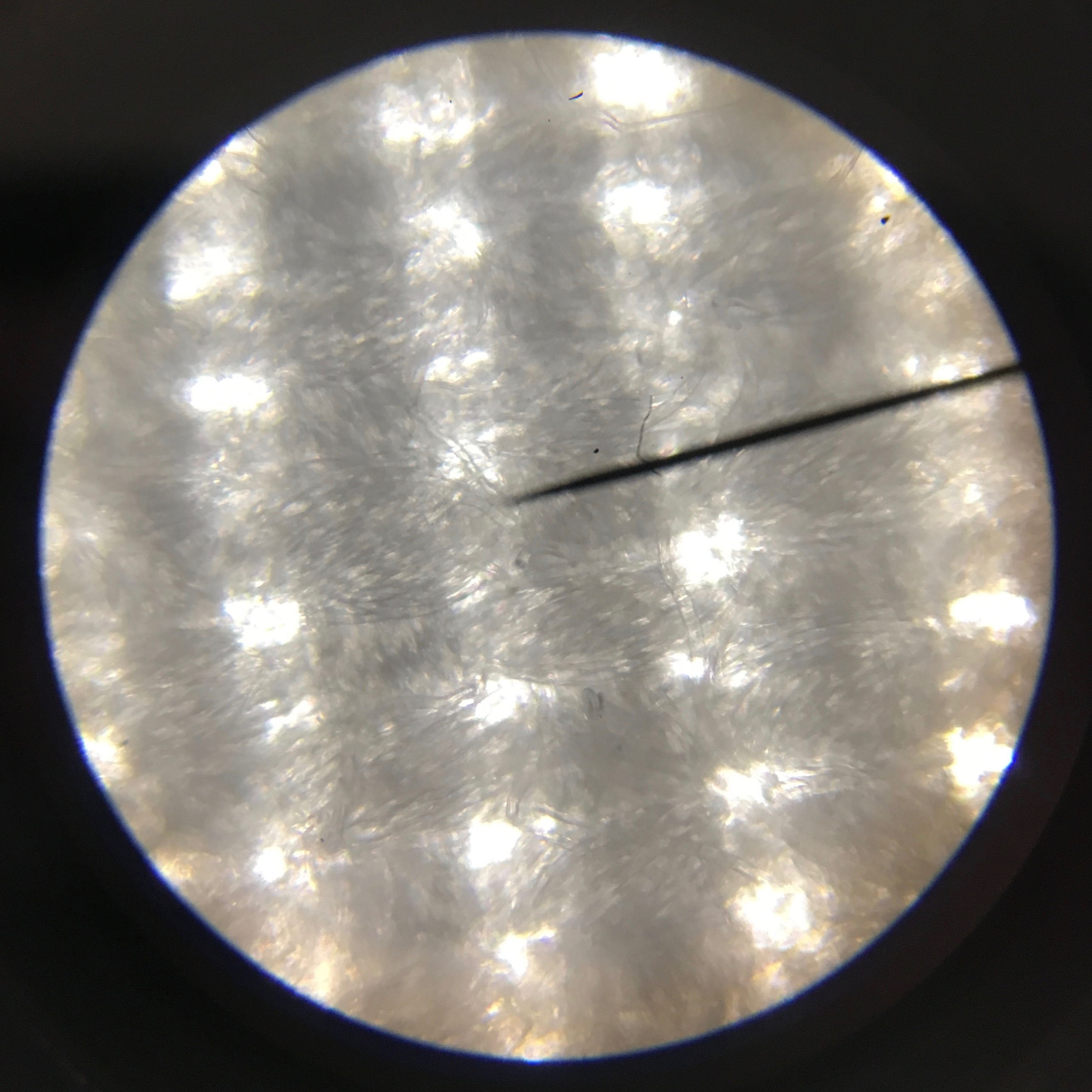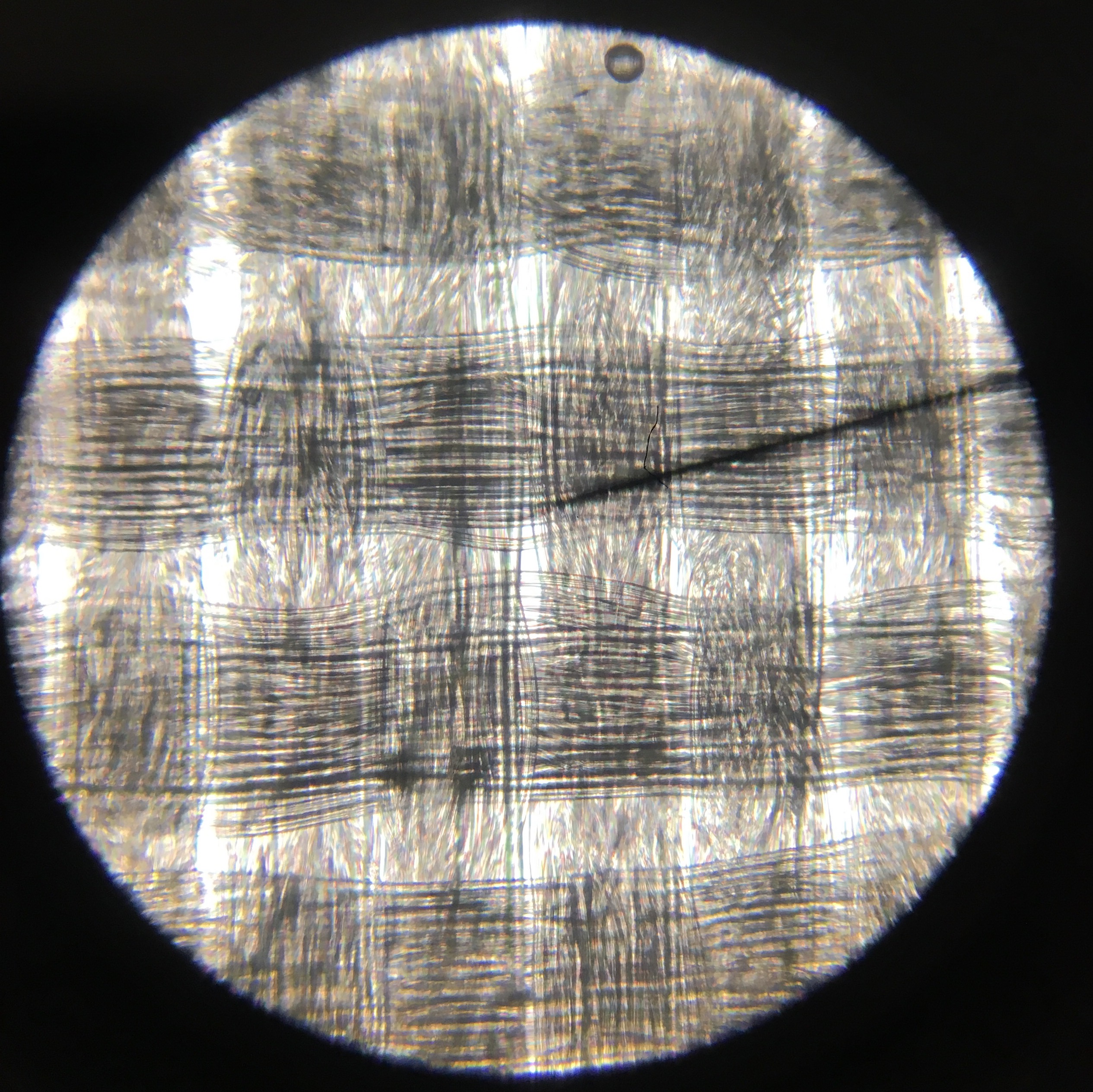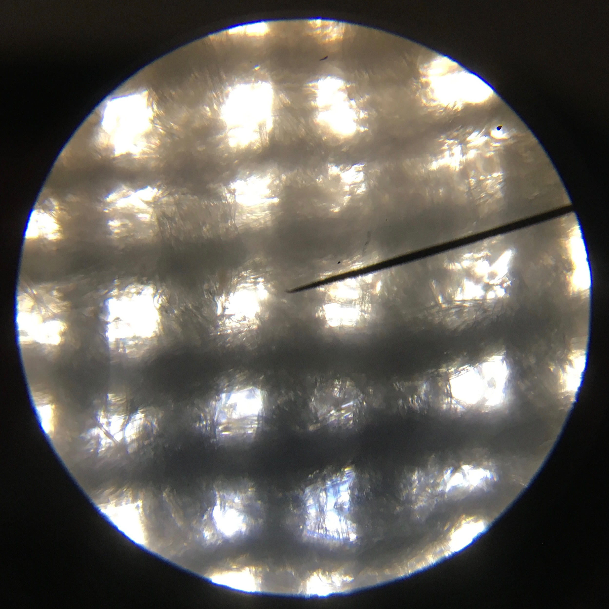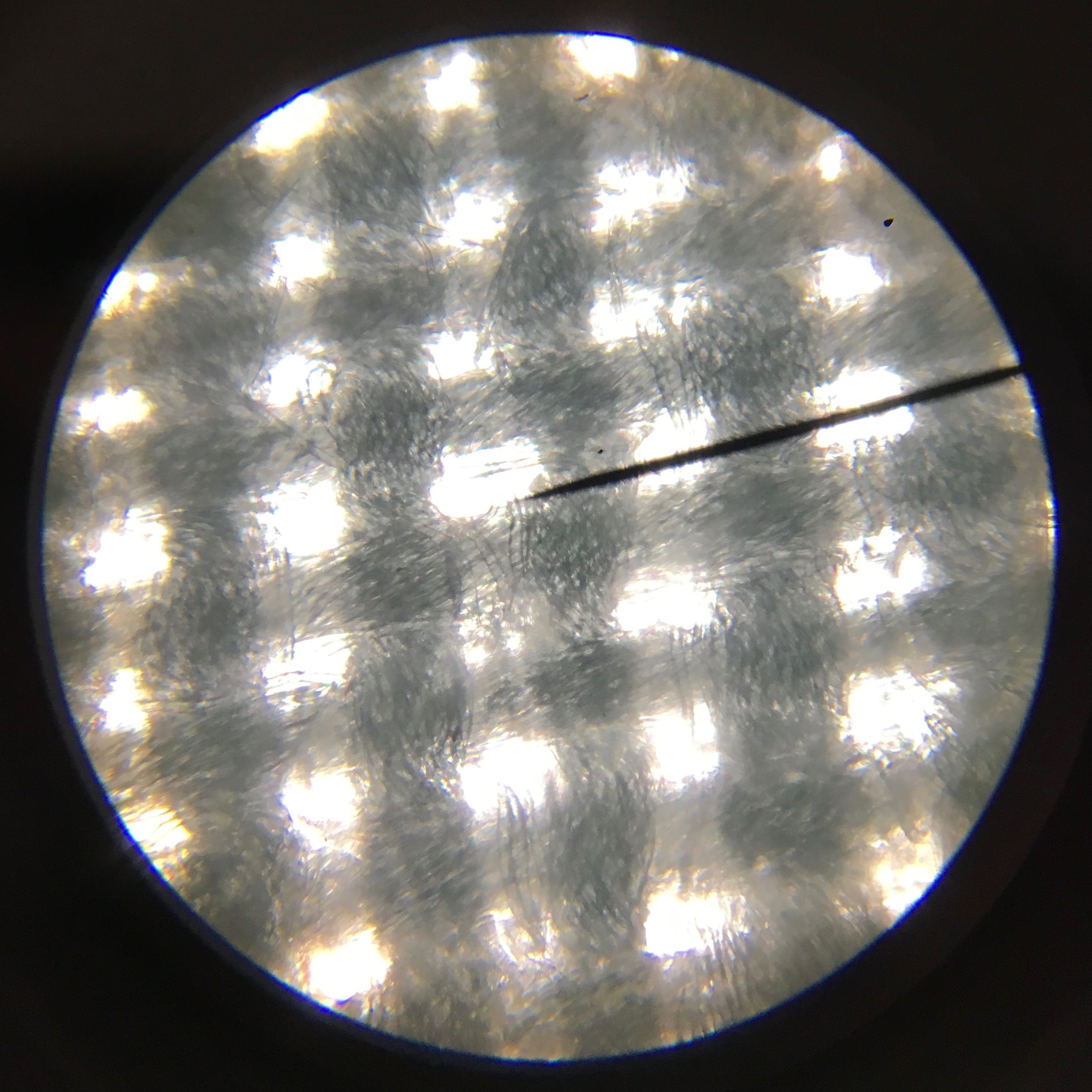 The last but not least is my current favourite fabric: the lilac polkadot viscose. I think that if I had to guess the type of weave, I’d say it is challis. What is interesting, is that I can count only 5 and 6 threads in vertical and horizontal directions, respectively. Despite of that the viscose fabric is amazingly drapy and soft, nothing like cotton with those thread densities and thread thicknesses. Before seeing the magnification I’d have guessed the viscose threads to be much thinner than the threads in the typical thin cottons but in fact, the drape of the fabric seems to be a property of the fiber.