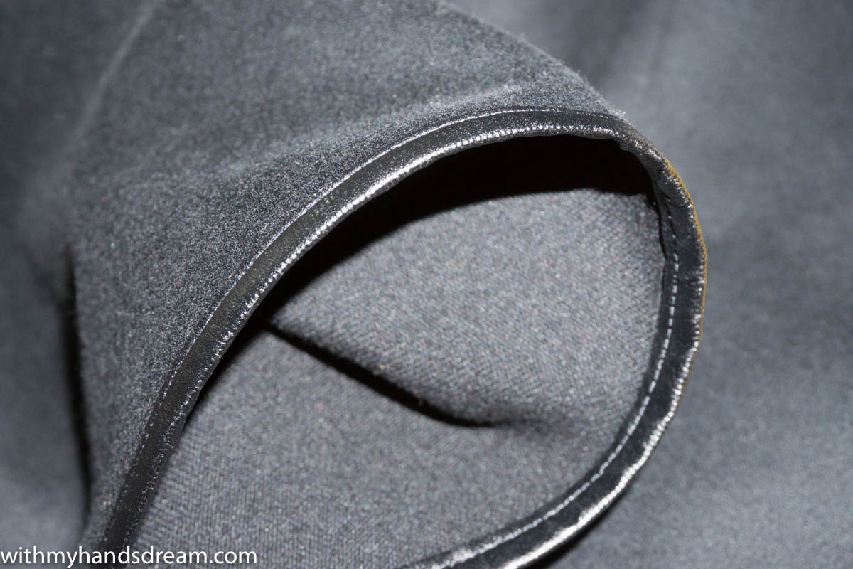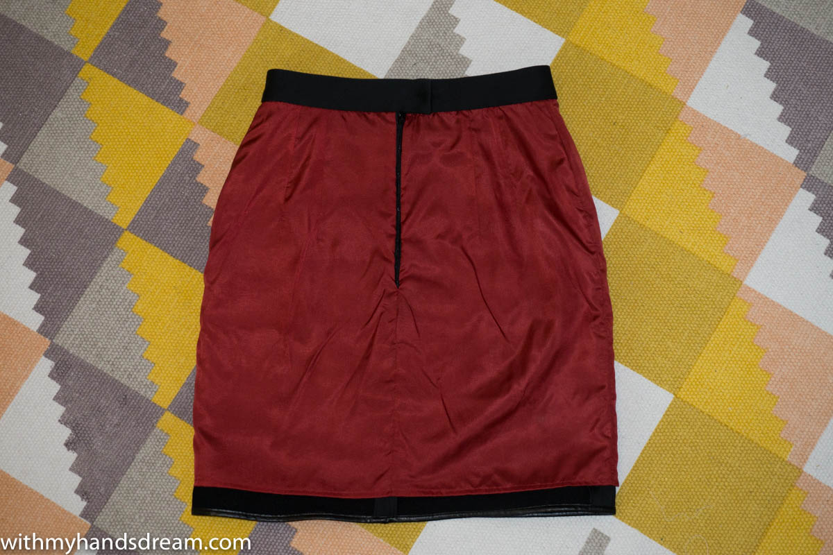 Since this fabric was a remnant from an old (unsuccessful) project I did not have enough fabric for the whole length. I had to make it about 4 cm shorter which I decided to compensate leaving out the slit and the hem fold and replacing it with a faux leather bias binding. I did not have enough black lining and because this was supposed to be a stash-busting project I did not go and buy more fabric but decided to use contrasting red-lining that was also a remnant from an old (unsuccessful) project. (Hmm… there seems to be a pattern, here.)