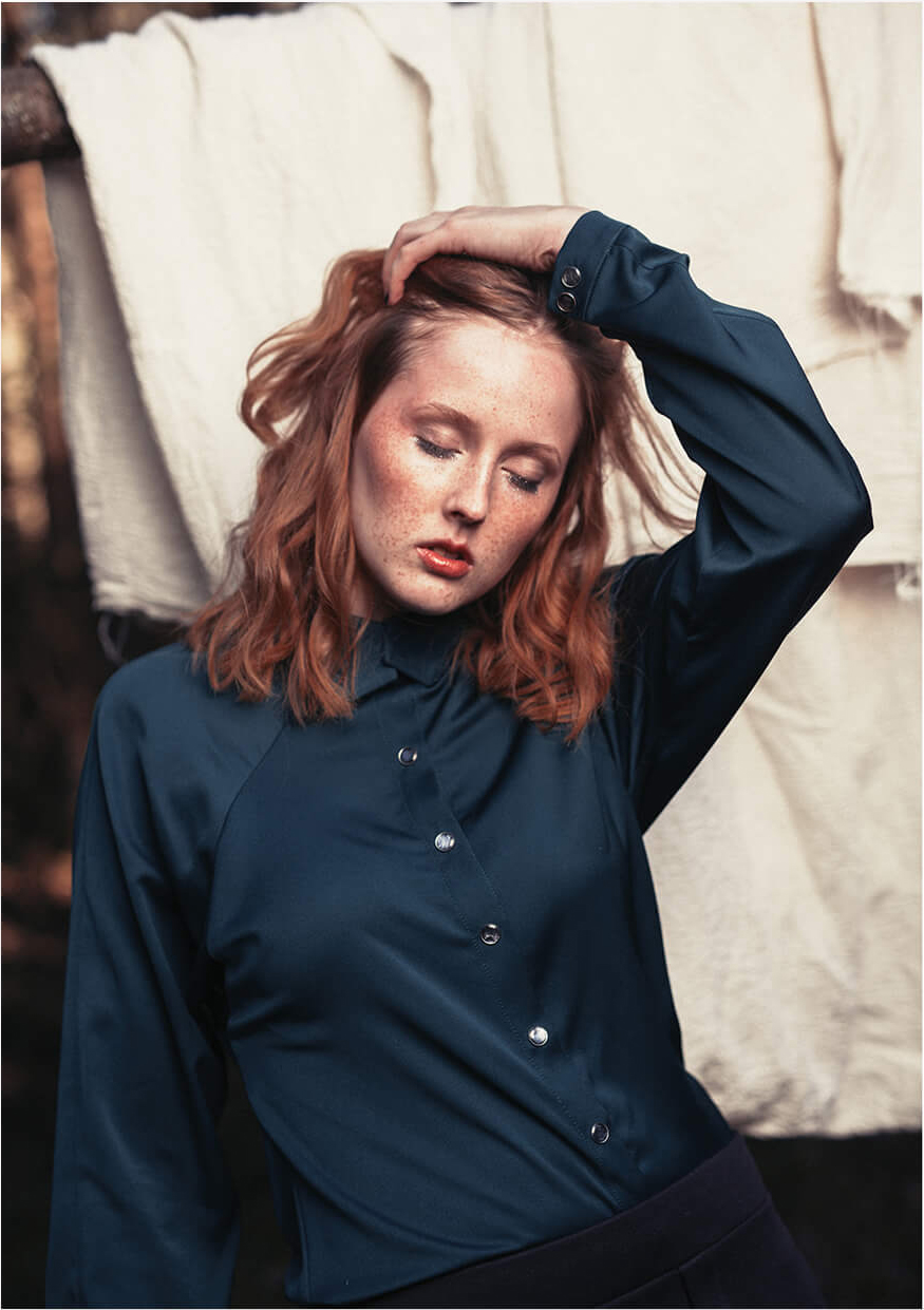 My favourite piece was this Stella raglan shirt with snap fastening and an unusual geometric collar. The green colour is just fantastic! Furthermore, the pattern is actually a 2 in 1 sewing pattern with a Pussy bow collar dress included. This means that there are quite a many possibilities for different combinations of these patterns.
