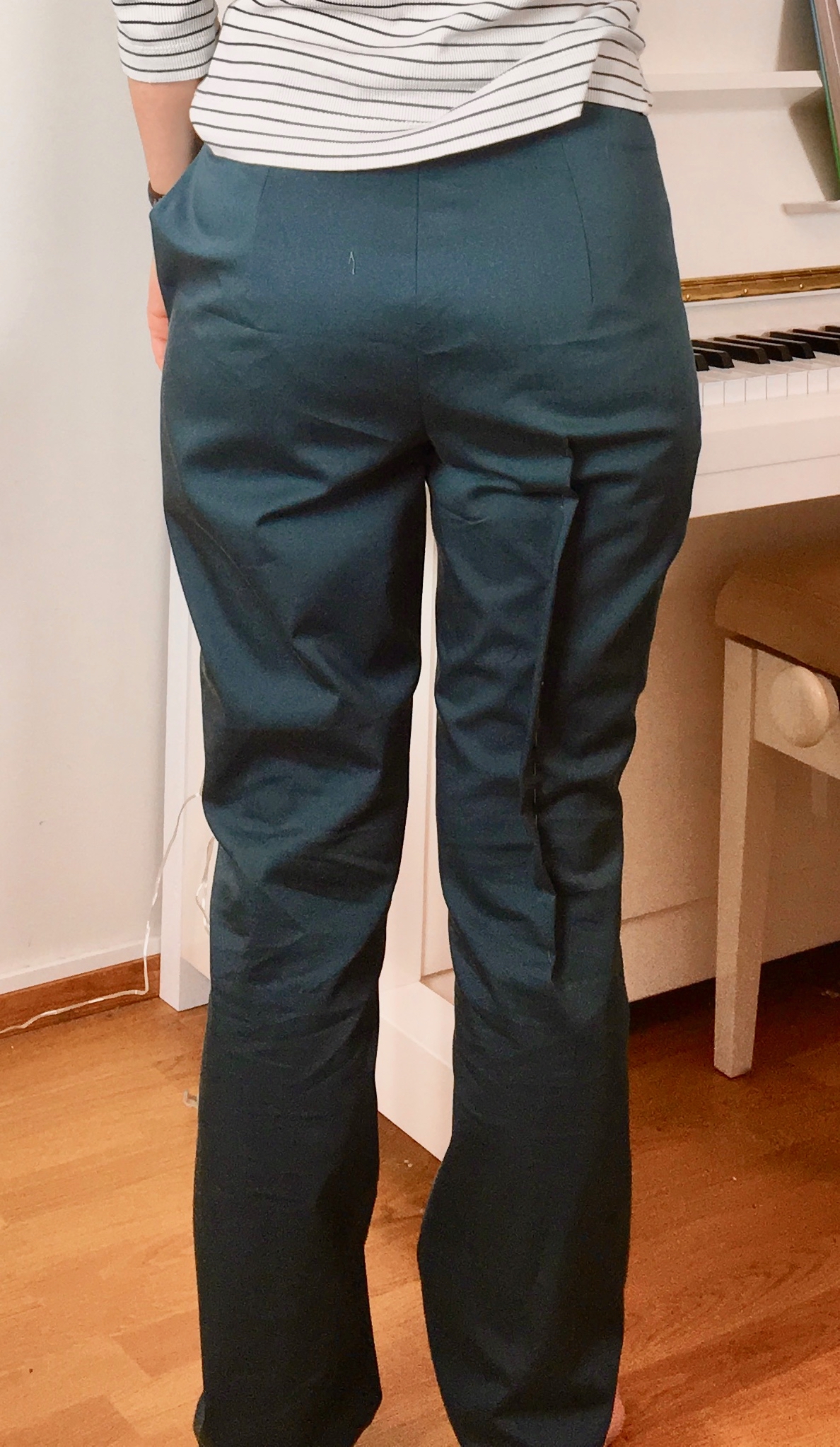 The fabric that I chose for these narrow trousers was green stretch cotton satin that I got from Marimekko outlet a while ago. Because of the stretch I also had to take a little of the hips. I determined the amount by pinning the extra fabric from the side seams while wearing the trousers. I also noticed that there was a bit extra at the centre back and I took that off, too. However, my careful work with the sloper paid off since the crotch still fitted beautifully.