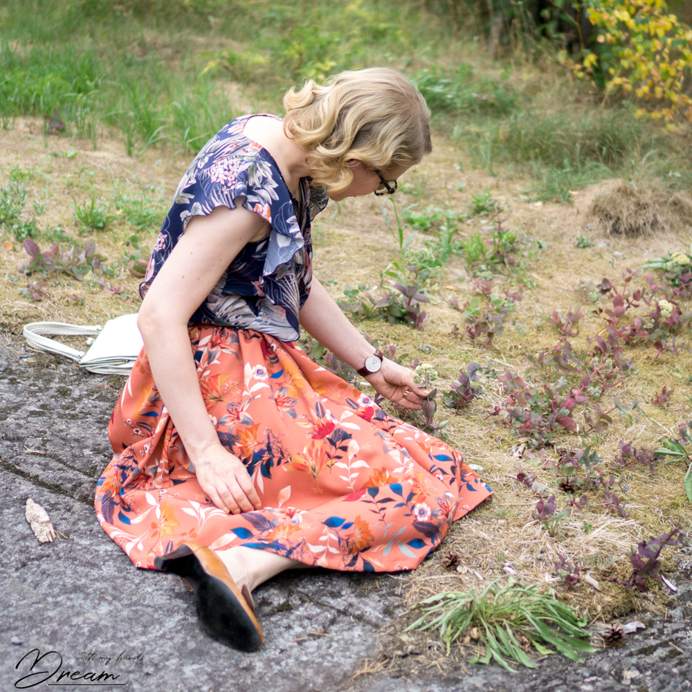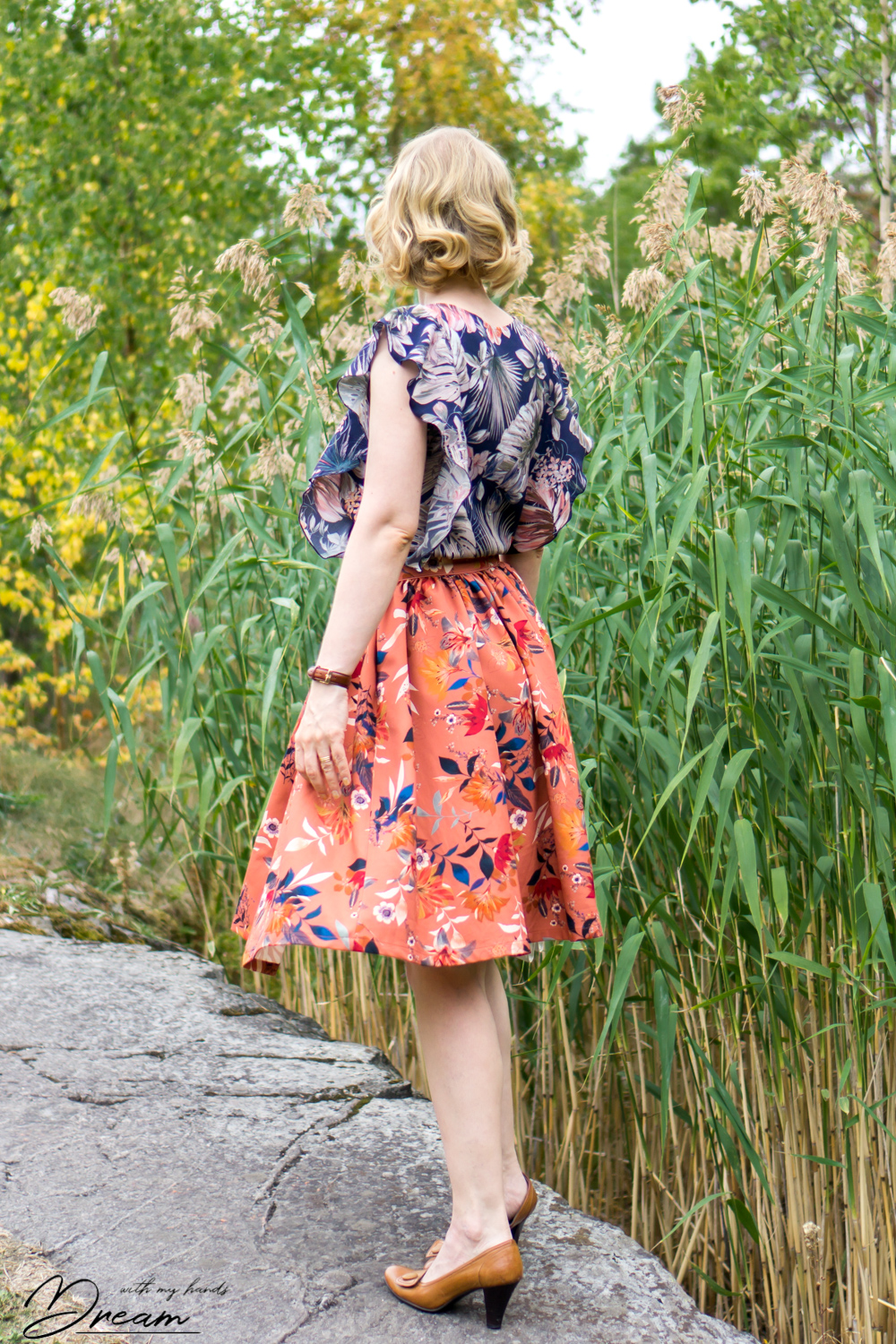 I really recommend this pattern. Unlike most of the ruffle tops, this flounce doesn’t have a gathered edge so it is very easy to stitch on. There are no sleeves, so no tedious sleeve fitting is needed. It also fits very nicely with my Rosie skirt. Normally combining two patterned fabrics would not work but this time the fabrics have similar colours.