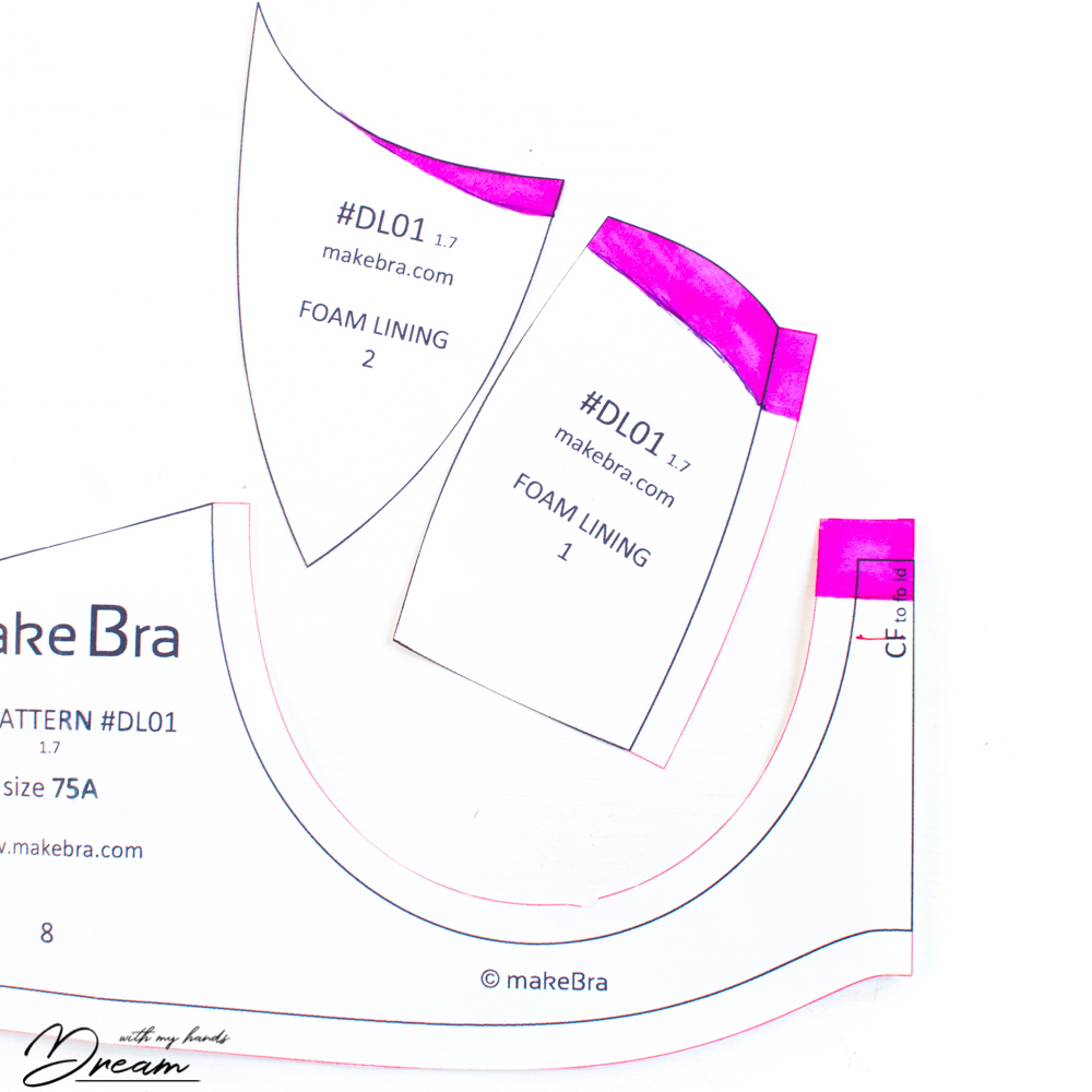 Above there are the pieces you’ll need to change (I haven’t included the cover fabric pieces since they are identical to the foam lining pieces, just with seam allowances.) I removed 15 mm (about 5/8″) from the top of the bridge. I also narrowed the bridge down a bit from the CF seam, since in my comfortable bras the bridge is slightly narrower. (This is not shown in the image above.) Then, to be able to fit the cup into the modified bridge, I made a curve across the top cup pieces and removed 15 mm from the edge nearest to the bridge tapering into nothing at the strap edge.