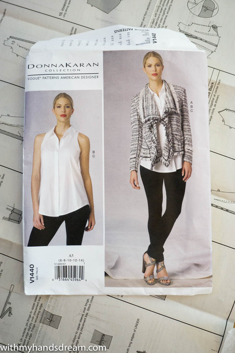 V1440 has three patterns in sizes 6 to 22. I have made the sleeveless blouse here. I also did the leggings back then but they came up too big and I never posted them. Luckily I decided to save them since I have gained a bit of weight since sewing those leggings and nowadays the size 12 fits quite nicely. The jacket, however, doesn’t really tempt me. It might work without the huge collar and the fronts that cover the interesting cut that the jacket has.