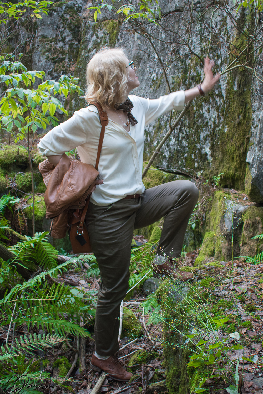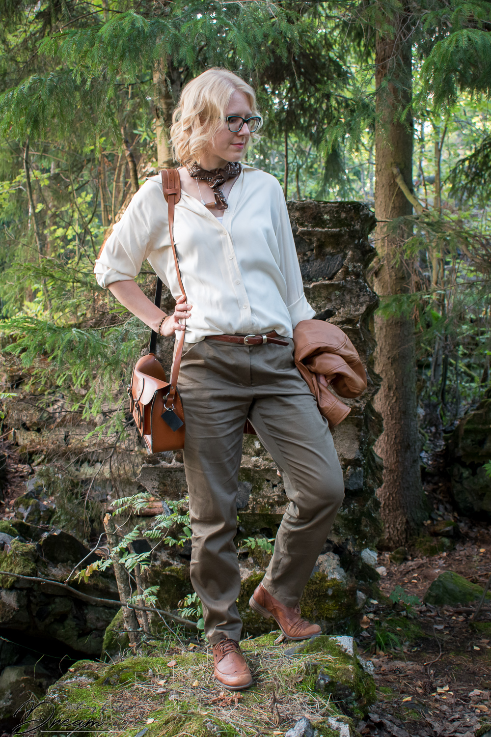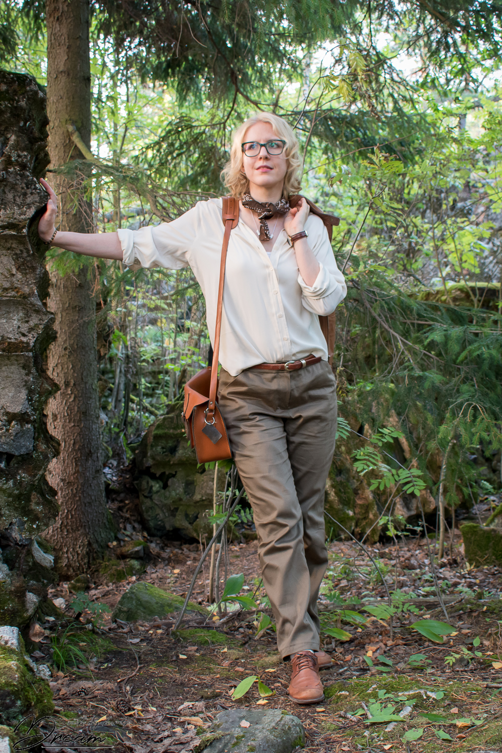 My husband M said that the trousers had sort of an army vibe to them. I, however, saw myself adventuring in the jungle alongside Indiana Jones. So I threw on one other fairly new make, a silk-blouse refashion to make my version of the adventuring archaeologist outfit. I couldn’t really get to a real jungle but luckily there were plenty of moss-covered ruins available! Sorry about the wrinkliness of the trousers. I had already worn them a while and thus the picture is pretty realistic in showing what they look in real life, wrinkles and all!