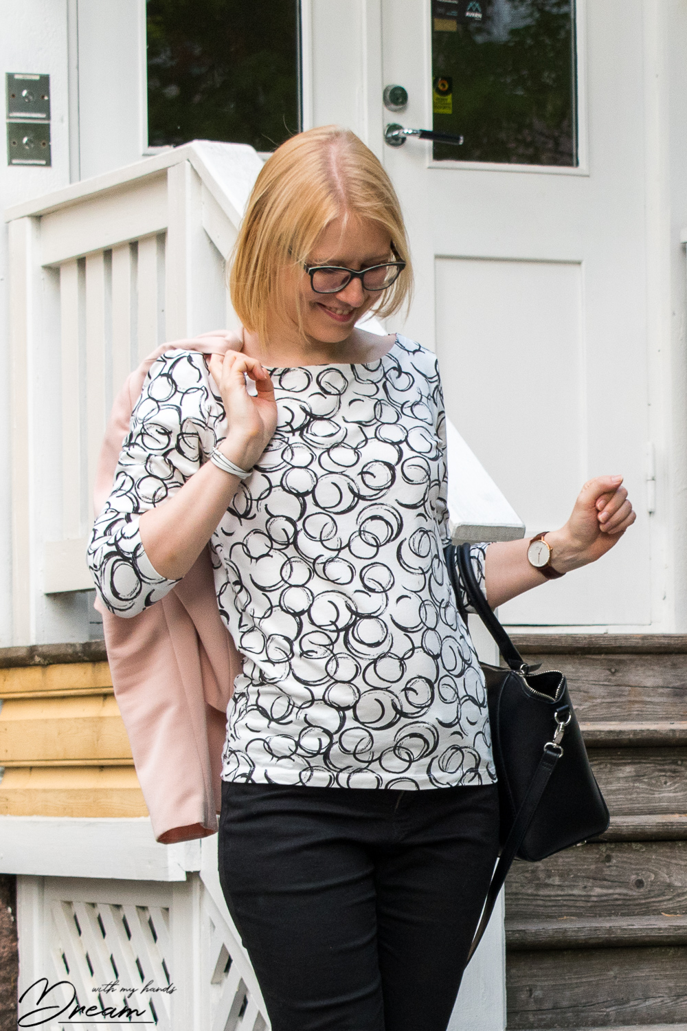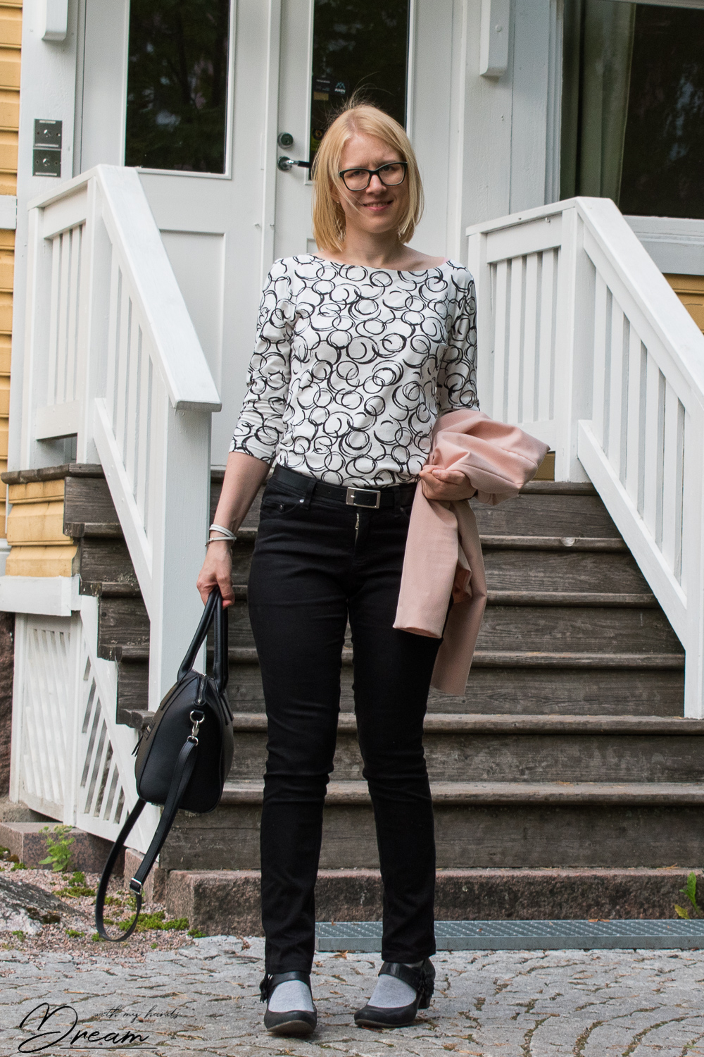 I love a boat-neck top, so the Edie tee from the new Sew Over It Work to Weekend e-book was immediately on my list of patterns to make. Combined with this fun swirly print, the top is both fun and modern and suits nicely with my black jeans. The jeans are based on my trusted trouser sloper. However, I used parts of Bootstrap fashion Vado jeans pattern to make the details. The pattern itself, that I have used before, doesn’t fit me anymore since my measurements have changed but I was able to use it to make some of the details.