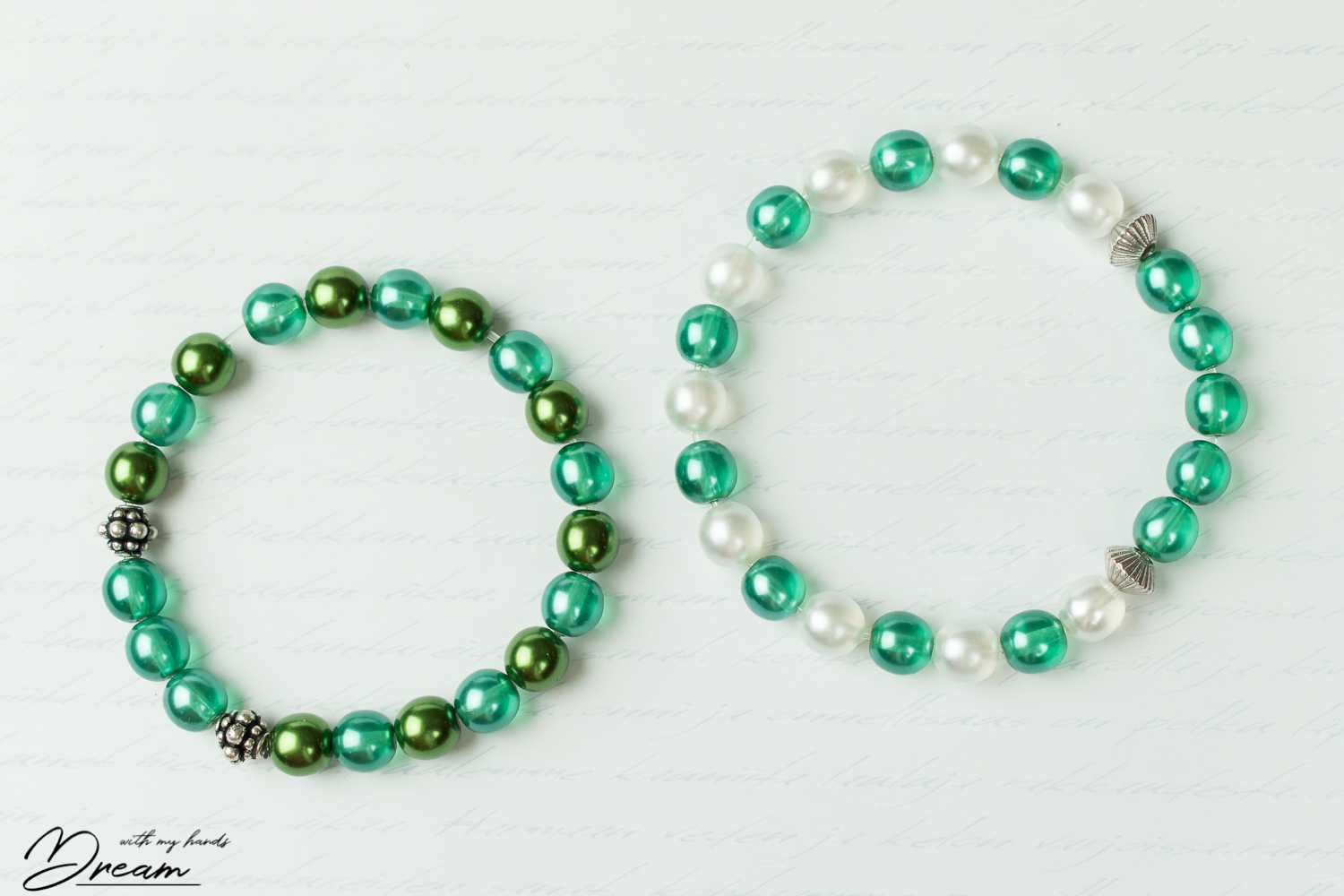 These bracelets are all 8 mm glass beads strung into either 0,7 or 1 mm elastic cord with two extra metallic beads.
