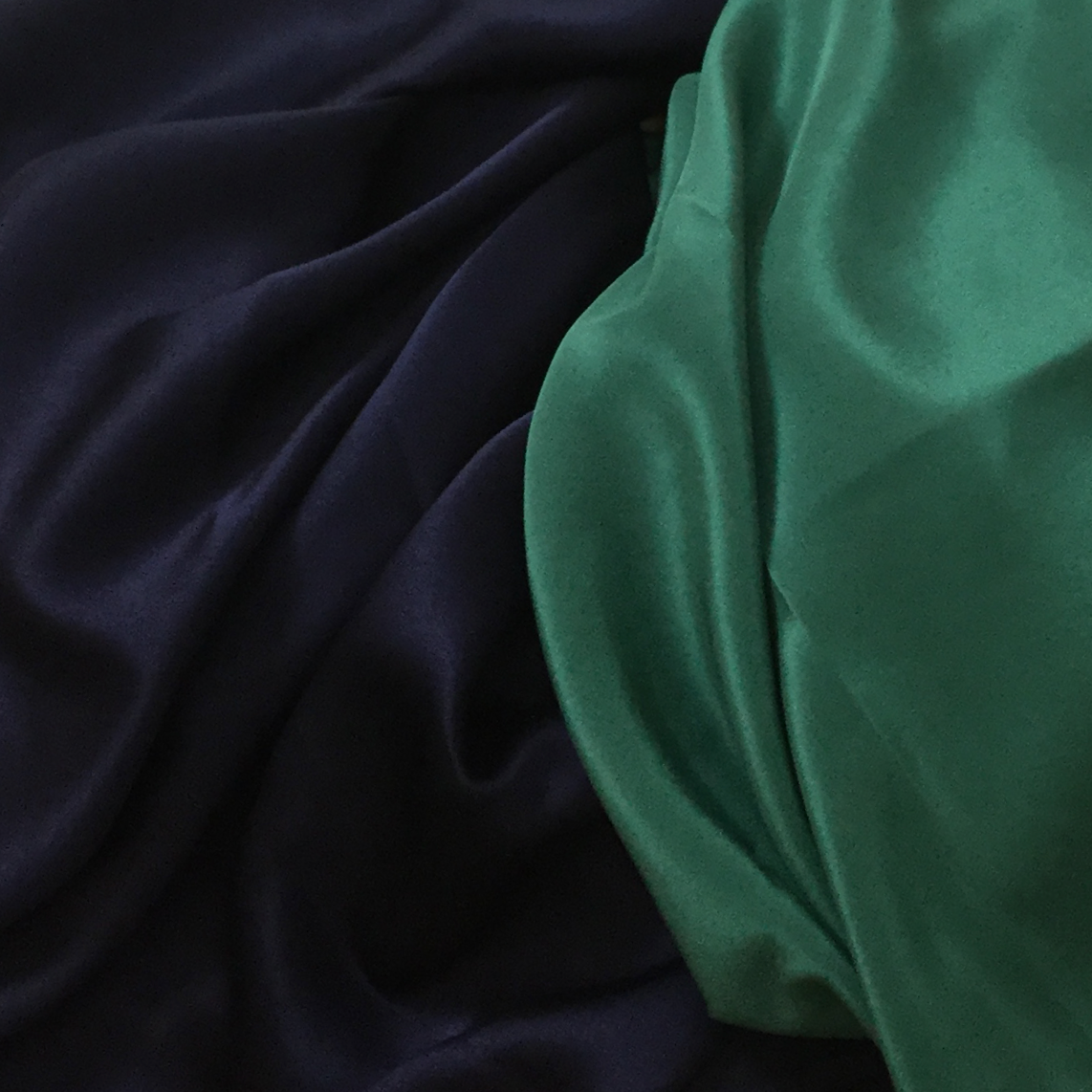 Feels warm and luxurious and has a clear sheen on it. Sometimes silk satin is hard to separate from polyester satin but silk doesn’t feel as “cold” as polyester and it is more expensive. Often requires dry cleaning or at least hand-washing. Always check the care instructions before buying! Also, remember that there are different kinds of silks that rance all the way from jersey to tulle and velvet!