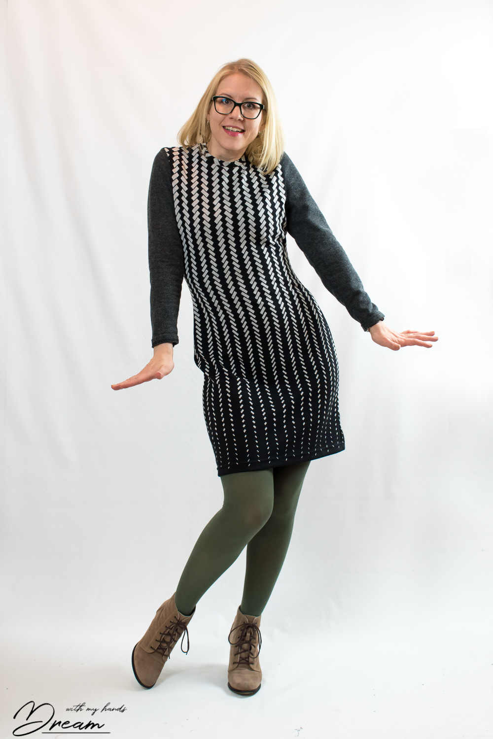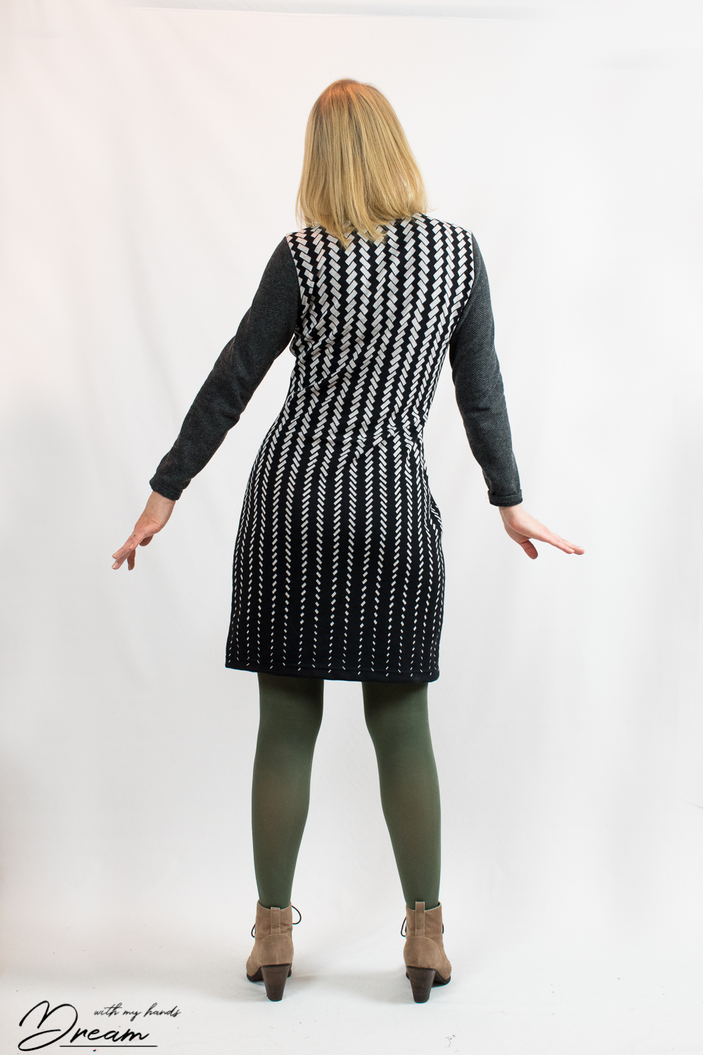 I thought it a nice idea to wear something from the actual book to the launch party so I quickly made this dress. My fabric was pretty thick knit, so I had to leave out the knot detail. I put in long sleeves, but I didn’t have enough fabric for them. Instead, I took some tweed like knit and made the sleeves from a completely different material. So, in my way, I broke this pattern!