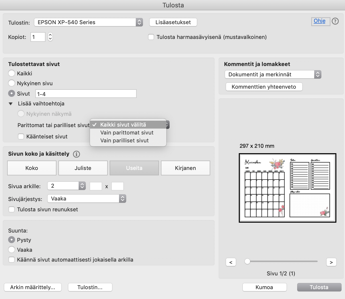- Nyt valitse sivujärjestykseksi “Käänteinen vaaka” tai “Käänteinen pysty” ja “Parilliset sivut”.