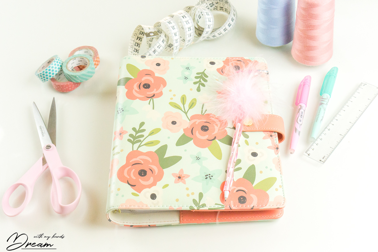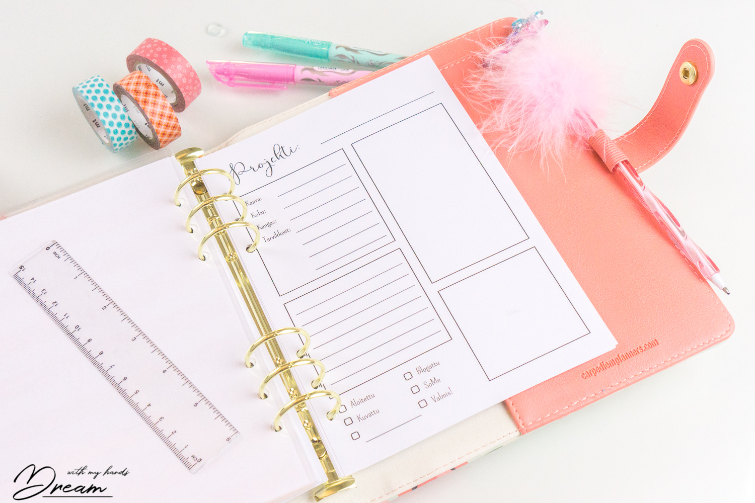 Hankin päivyriäni varten tyhjän Simple Stories Carpe Diem päivyrikansion Heidin korttipajasta. Minulla sattui olemaan valmiiksi kuuden reiän rei’itin, jolla sain rei’itettyä sivut tällaiseenkin kansioon. Myös tavallinen yleisesti myytävä A5-kokoinen kansio toimii ja sen etuna on helpompi rei’itettävyys tavalliselle suomalaisella rei’ittimellä.
