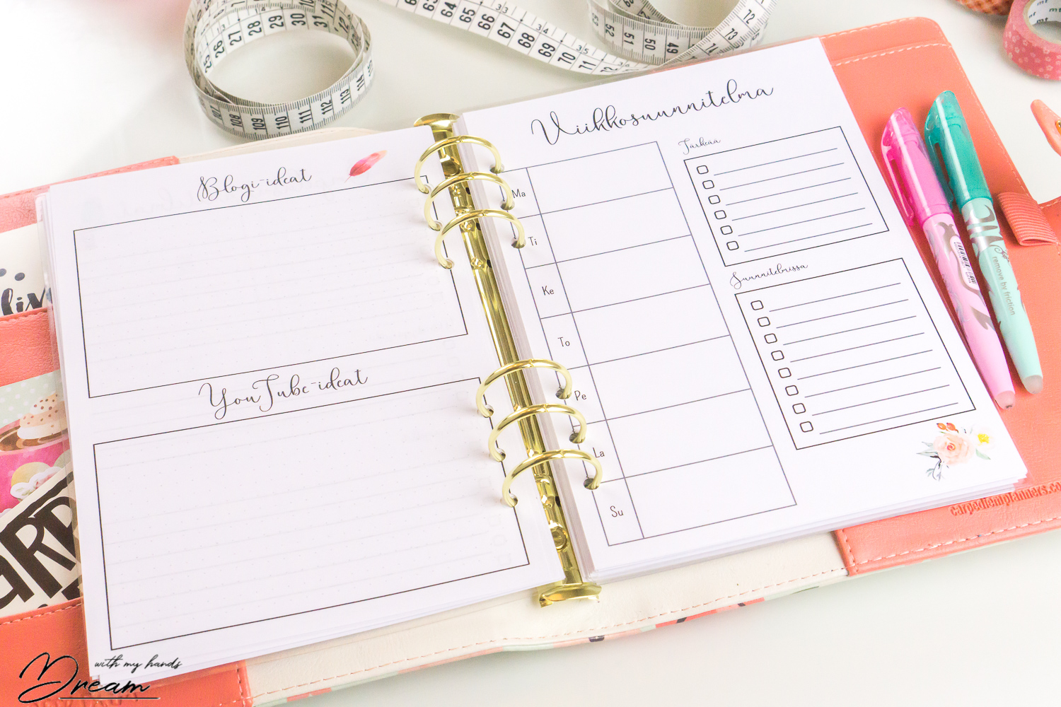 Viikkosuunnitelmaa varten löytyy viikkoruudukko, johon voi kirjata tärkeimmät menot ja tavoitteet. Kiireisempiä päiviä varten löytyy vielä päivänäkymä: