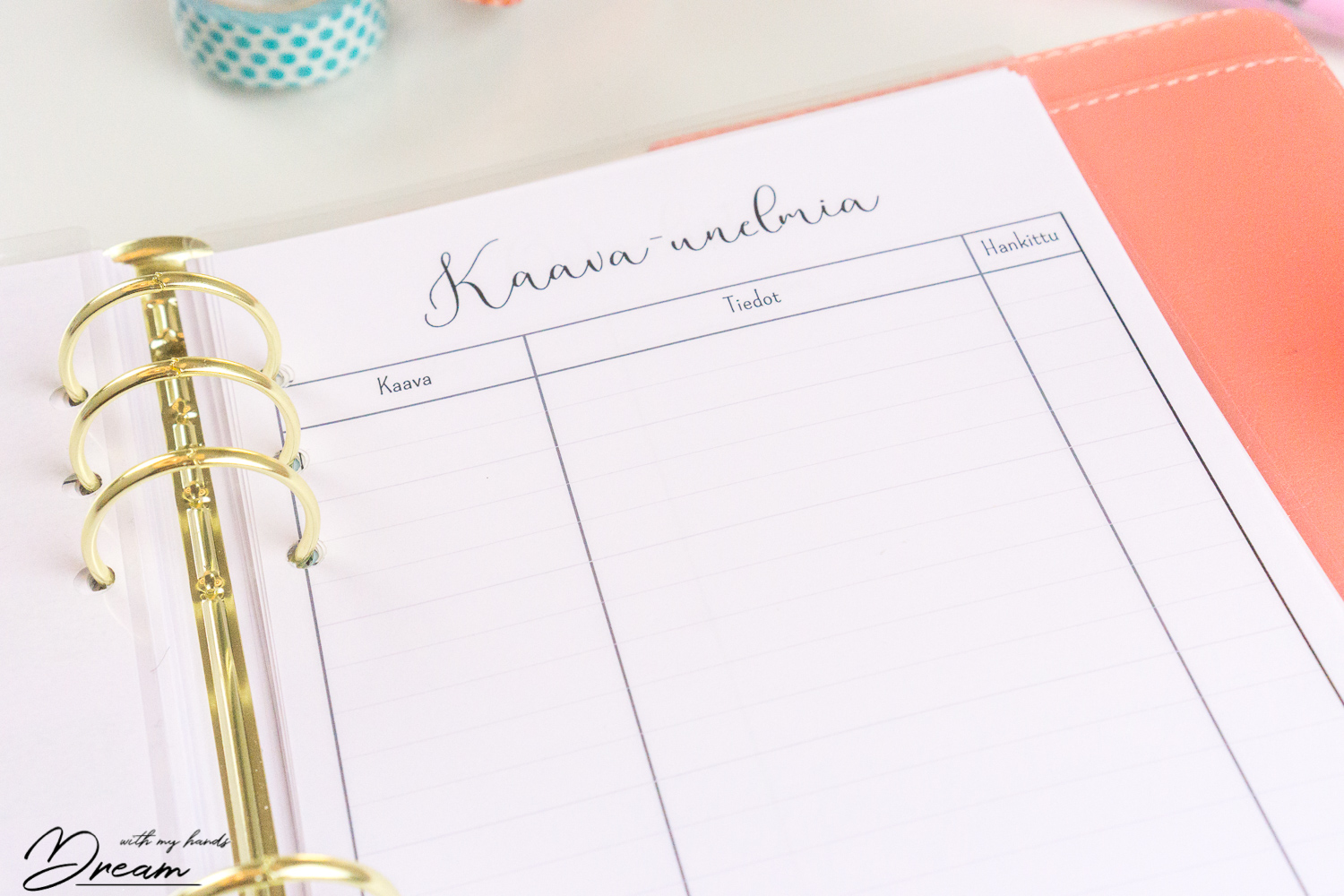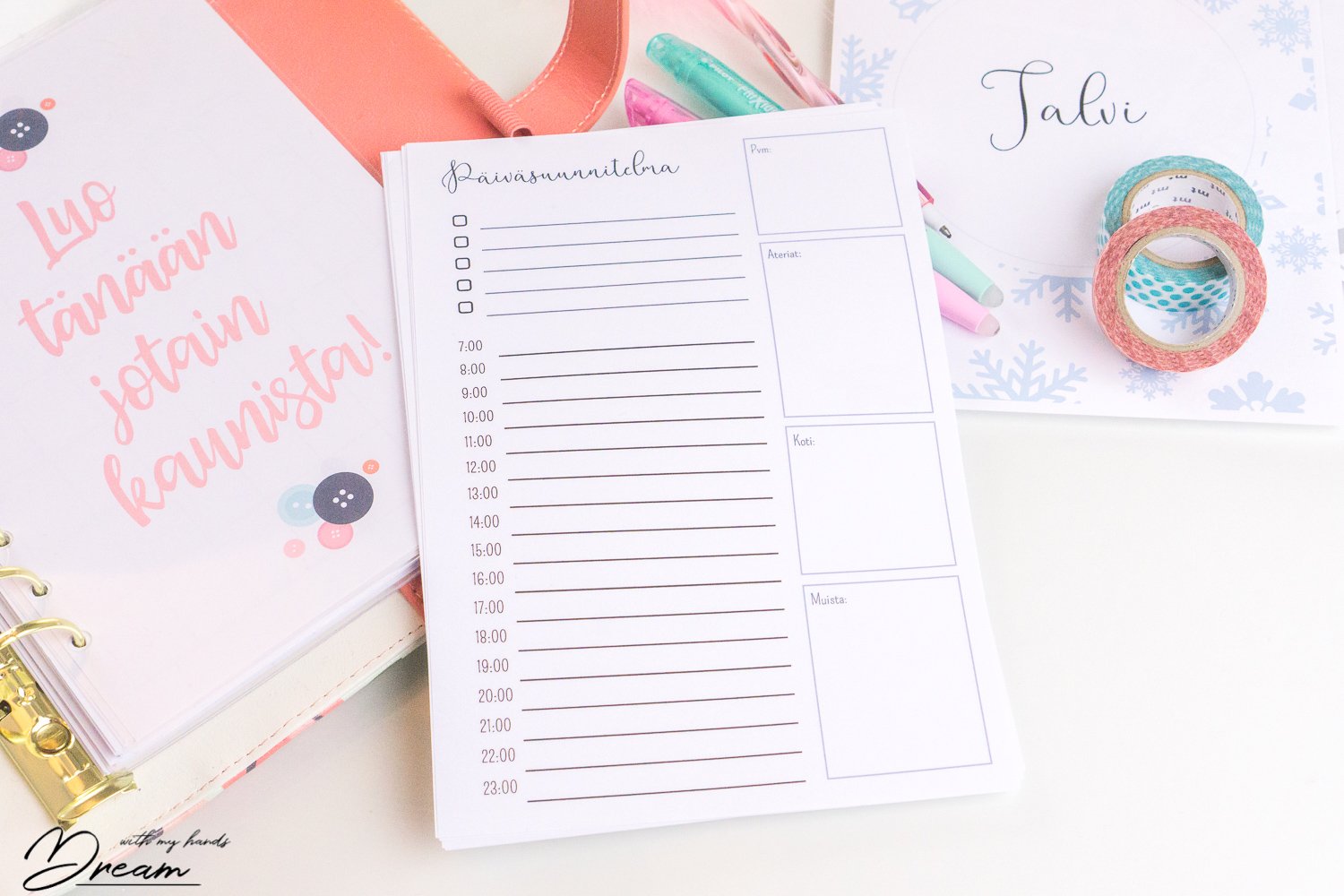 Muistikirja on pdf-muodossa ja suunniteltu printattavaksi kotiprintterillä A5-kokoiselle paperille (Printtaaminen onnistuu myös A4-paperille, jolloin arkit voi leikata lopuksi keskeltä kahtia. Tulostusohje on postauksen lopussa!). Sivuja muistikirjassa on 83, mutta useat sivuista on tarkoitettu printattavaksi useamman kerran. Tämän jälkeen voit rei’ittää sivut ja laittaa ne haluamaasi järjestykseen kansioon. Voit myös printata joitakin sivuja useampia kertoja. Asioiden yksinkertaistamiseksi esim. Päiväsuunnitelma-sivu on pdf-tiedostoissa vain kerran.