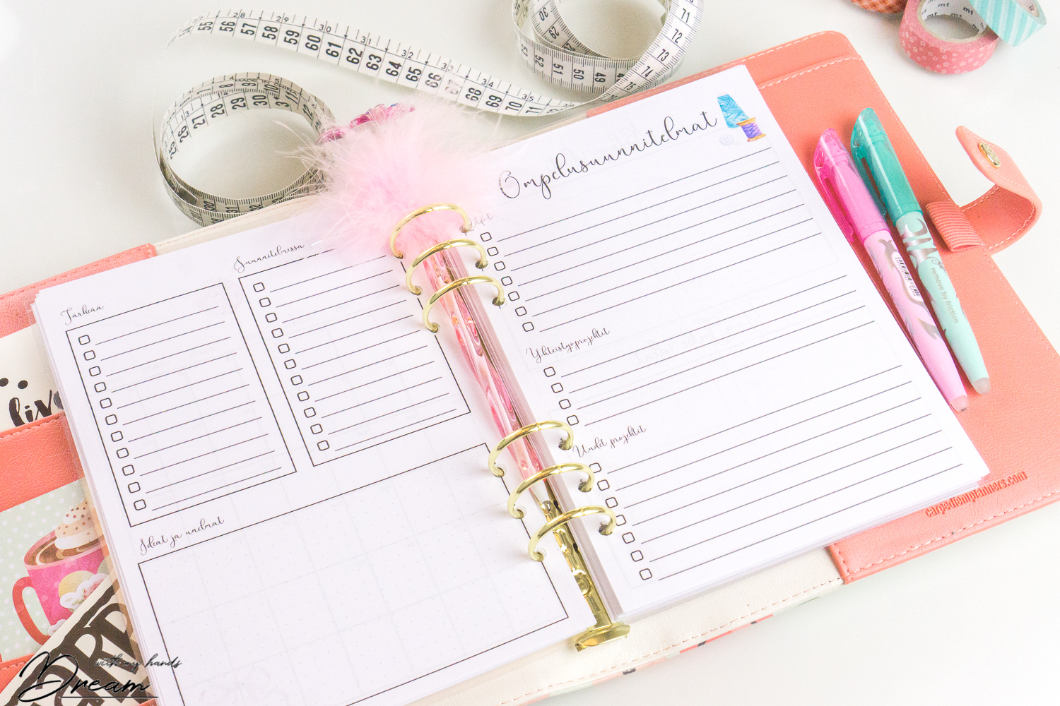 Ihania välilehtiä löytyy kokonaiset kahdeksan kappaletta. Neljässä niistä on ompeluteema ja toiset neljä kuvaavat neljää vuodenaikaa. Jälkimmäiset voi sijoittaa vaikka kuukausisivujen väliin sellaisiin ajankohtiin, kun käyt läpi talvivaatekaappia, mietit kodin kevättöitä tai pohdit kesälomasuunnitelmia. Näin vuodenaikoihin liittyvät pohdinnat löytyvät yhdestä paikasta.