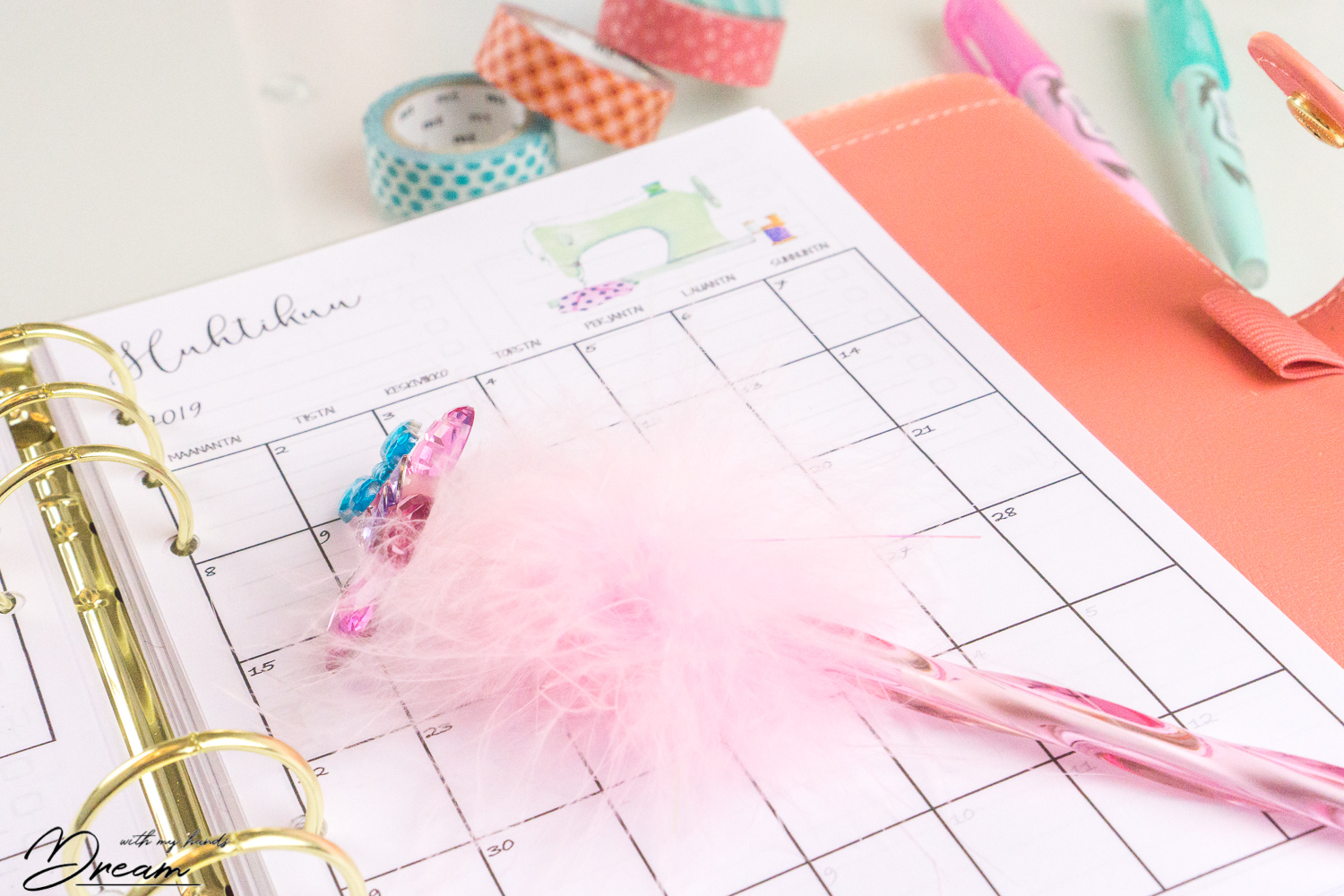 Muistatteko vanhan Sewist’s notebookini lisäosineen? Olen käyttänyt sitä paljon ja töherrellyt sinne ompelusuunnitelmiani, sekä kerännyt tarpeellisia mittoja. Lisäksi olen käyttänyt Bullet journalia, kun olen yrittänyt saada ompelusuunnitelmani järjestykseen. Bullet journalissa on kuitenkin se huono puoli, että kun sitä kiireisenä tarvitsisi, ei oikein ole aikaa piirrellä kalentereita ja muita järjestyksenpitoa helpottavia asioita. Päätin sitten, että on aika suunnitella ihan ihka oma Ompelijan muistikirja, joka yhdistäisi nuo kaksi käyttämääni muistikirjaa yksiin kansiin. Syntyi siis Ompelijan muistikirja 2019! Ja mikä parasta, voit hankkia sen myös itsellesi blogikaupastani!