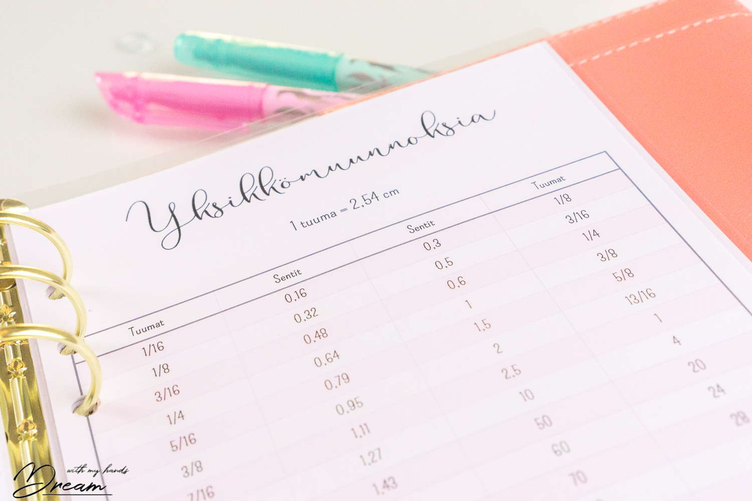 Ulkomaisia ompeluohjeita varten loin kätevän taulukon, jolla tuumien muuttaminen senteiksi käy helposti ja nopeasti: