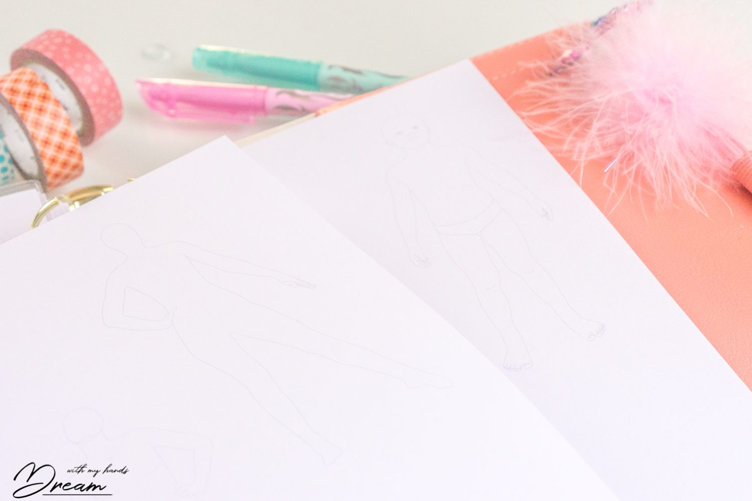 Seuraava kuva on hieman epäselvä, mutta tarkoituksella. Näille sivuille olen sijoittanut vanhoista muistikirjoistani tutut himmeät vartalomallit, joiden päälle on helppo luonnostella vaatesuunnitelmia. Nyt suunnittelu onnistuu, vaikka ihmisvartalon piirustustaitosi ei olisikaan ihan Gallen-Kallela -tasoa!